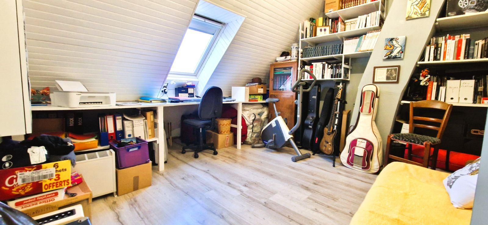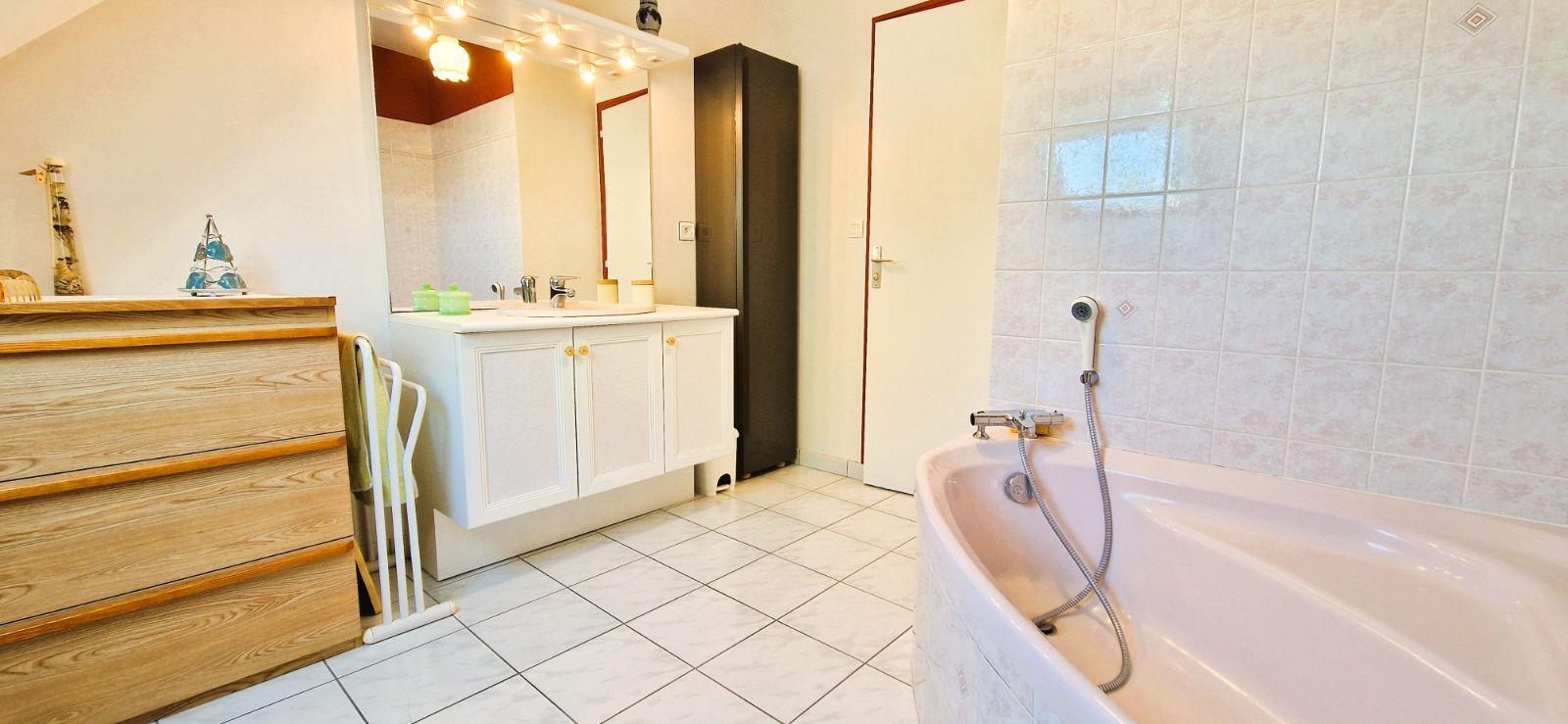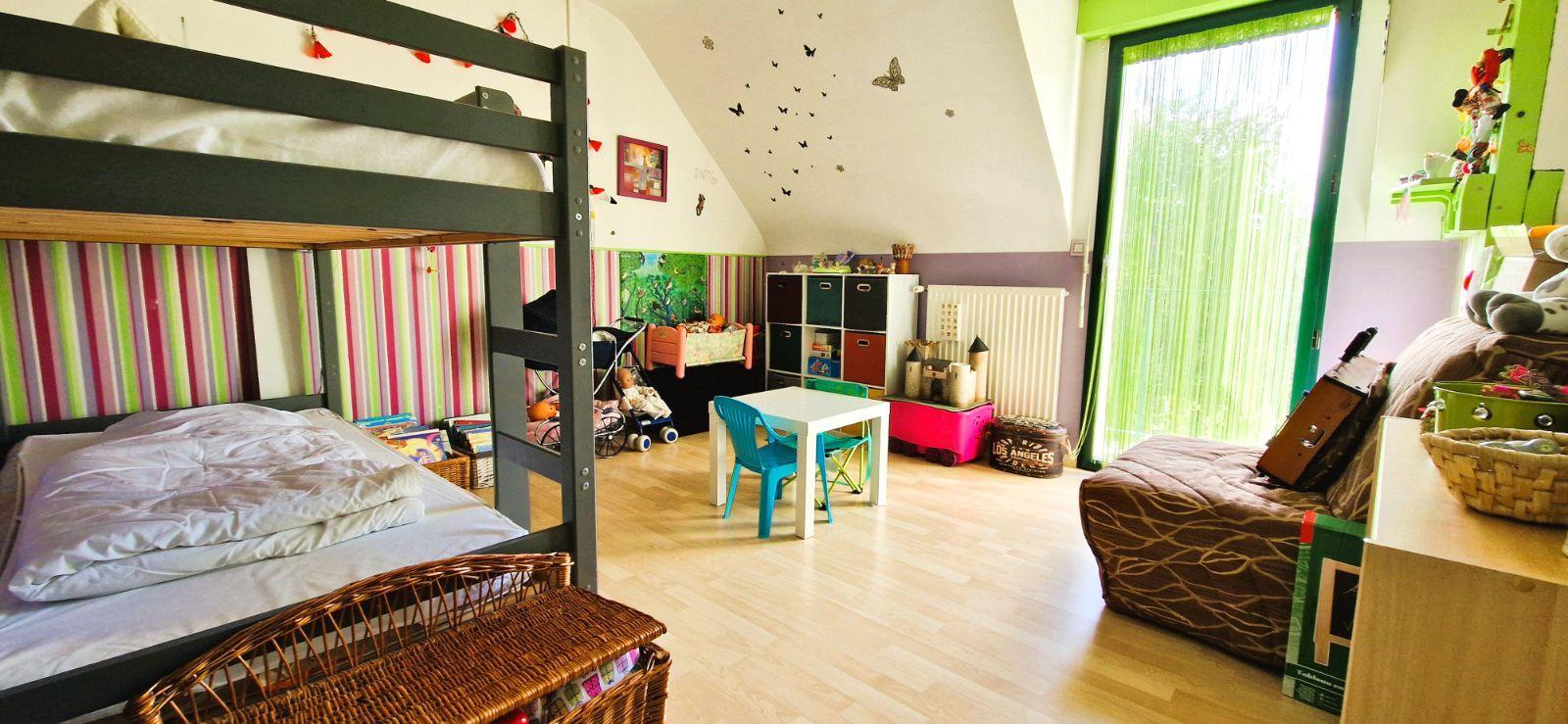 A l’étage : un lumineux dégagement avec grand placard desserre : trois chambres confortables dont deux avec placards, un grenier aménagé en espace bureau, une salle de bain et un wc séparé.